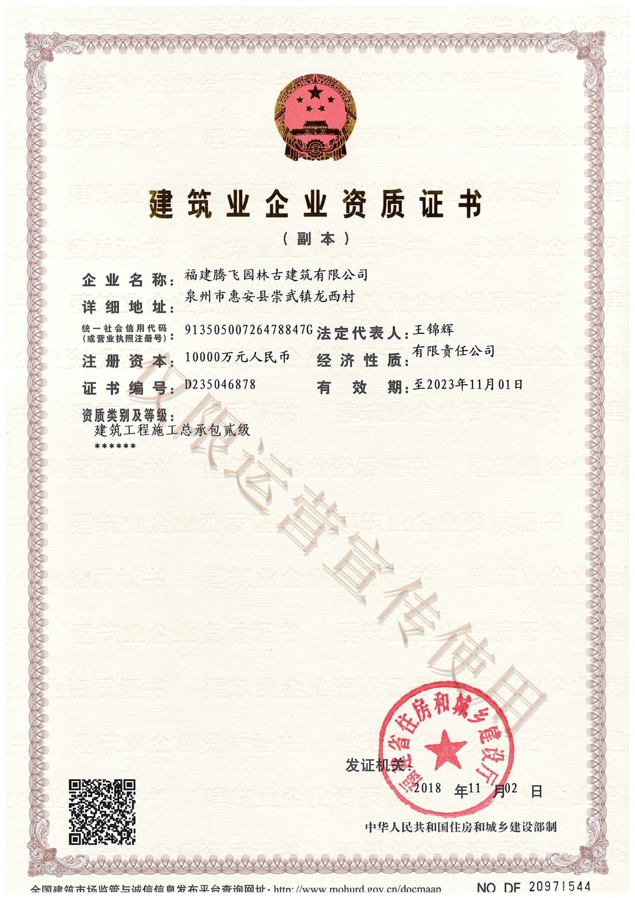 日前,从福建省住房和城乡建设厅传来喜讯:福建腾飞园林古建筑有限公司建筑工程施工总承包二级资质申请已经通过最终审查,申报成功并领取证书。这标志着我公司已经具备了建筑工程的施工能力,是公司优化业务结构,构建多元化经营格局的重要举措,为公司顺应国家基础设施建设需求,开拓建筑工程施工市场提供了有力保障。